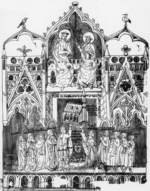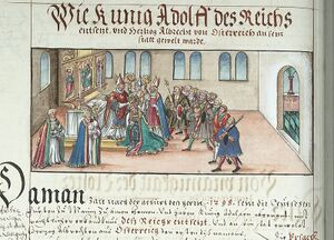 Afzetting van Adolf van Nassau en verkiezing van Albrecht I van Habsburg tot koning. Weergave uit de kroniek van de bisschoppen van Würzburg
