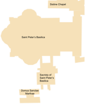 - Het Apostolische Paleis met de Cappella Paolina (Paulinische Kapel), de kapel waar de kardinalen de mis volgen voor de eerste stemronde van de dag. Ze wordt van de Sixtijnse Kapel gescheiden door de Sala Regia, waarlangs de kardinalen in processie de Sixtijnse Kapel betreden.[27]