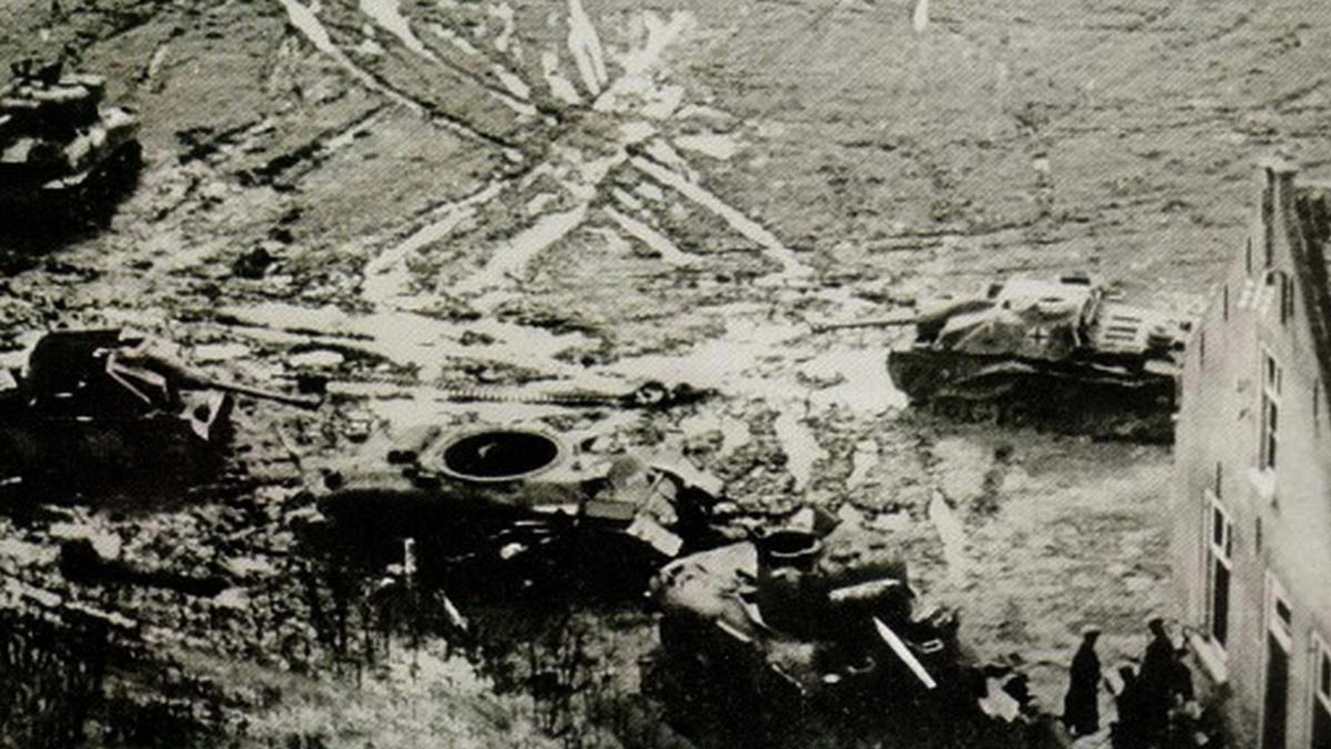 Diverse 'Stugs', een Hetzer-tankjager en Duitse halftracks achter de dijk worden stukgeschoten. De geallieerden verliezen zeker drie Shermantanks. En manschappen aan beide kanten.